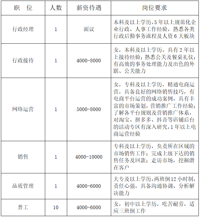 职位要求:1.大专及以上学历,人力资源管理、行政管理等相关专业优先。2. 具备3年以上行政人事管理工作经验,有装饰、家装设计企业工作经验优先。3. 具备良好的沟通、协调、组织能力,能够熟练使用办公软件。4.工作细致、认真,具备较强的责任心和团队合作精神。