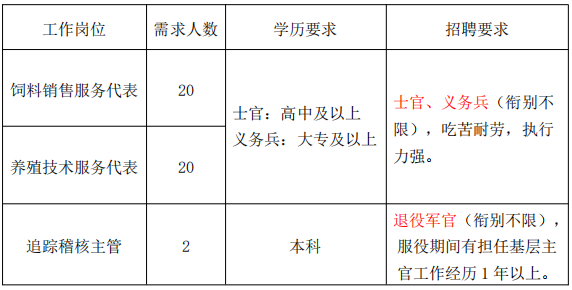 应聘条件:退役士兵、退役军官(衔别不限),认可正大集团企业文化,年龄 40 周岁以下,性别不限,品行端正,吃苦耐劳,执行力强。